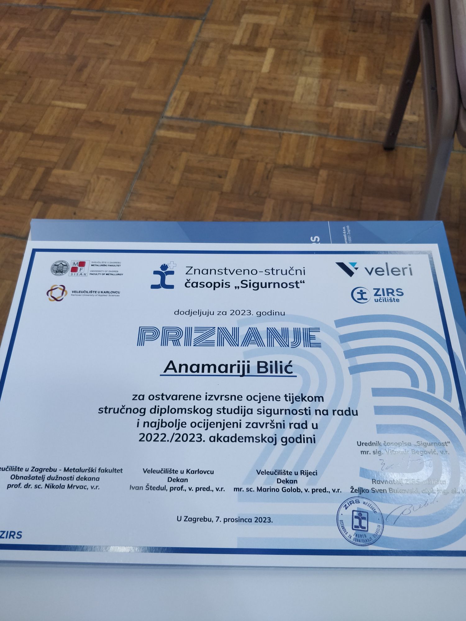 Na 23. godišnjoj nacionalnoj konferenciji s međunarodnim sudjelovanjem „Znanjem do sigurnosti i zdravlja na radu“ u organizaciji  ZIRS učilišta - ustanove za obrazovanje odraslih, znanstveno-stručnog časopisa „Sigurnost“ i suorganizatora, Hrvatskog društva za medicinu rada – Ogranak Zagreb studentici Anamariji Bilić dodijeljeno je priznanje i nagrada kao najboljoj studentici studija zaštite i sigurnosti na Veleučilištu u Rijeci. Studentica je napisala diplomski rad s naslovom Stavovi zaposlenika o sigurnosti na radu i kultura sigurnosti na radu pod mentorstvom dr. sc. socio. Anite Stilin u okviru kolegija Menadžment sigurnosti na radu što ukazuje na važnost razvoja „mekanih“ vještina inženjera sigurnosti i zaštite te potrebu povezivanja društvenih i tehničkih znanosti.