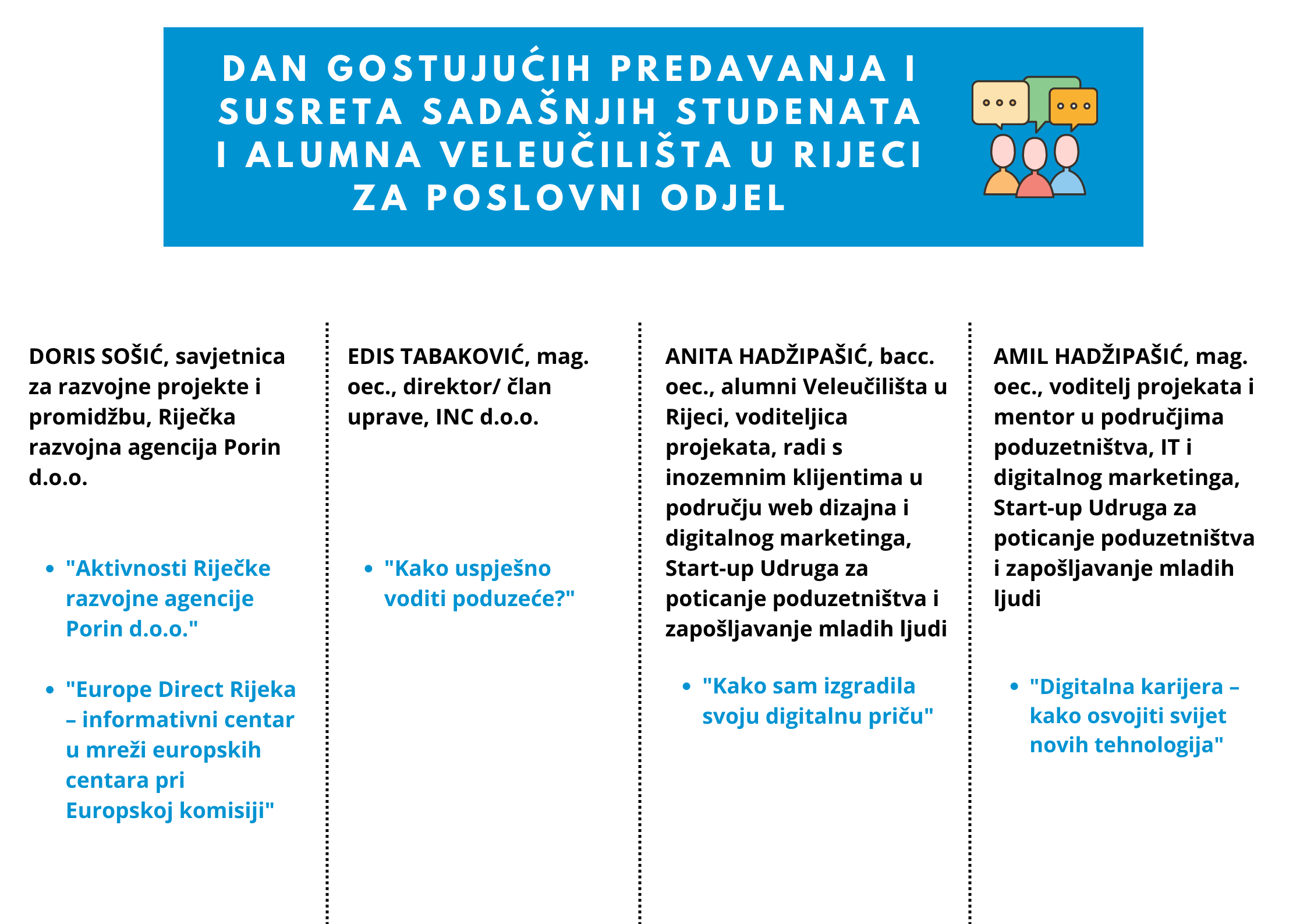 - Anita Hadžipašić, bacc. oec., alumni Veleučilišta u Rijeci, voditeljica projekata, radi s inozemnim klijentima u području web dizajna i digitalnog marketinga, Start-up Udruga za poticanje poduzetništva i zapošljavanje mladih ljudi – tema predavanja: „Kako sam izgradila svoju digitalnu priču“
