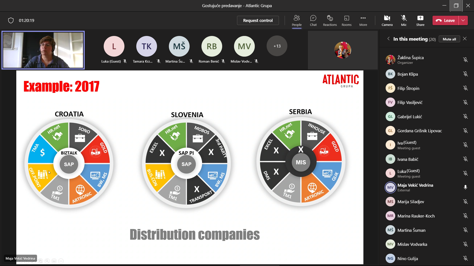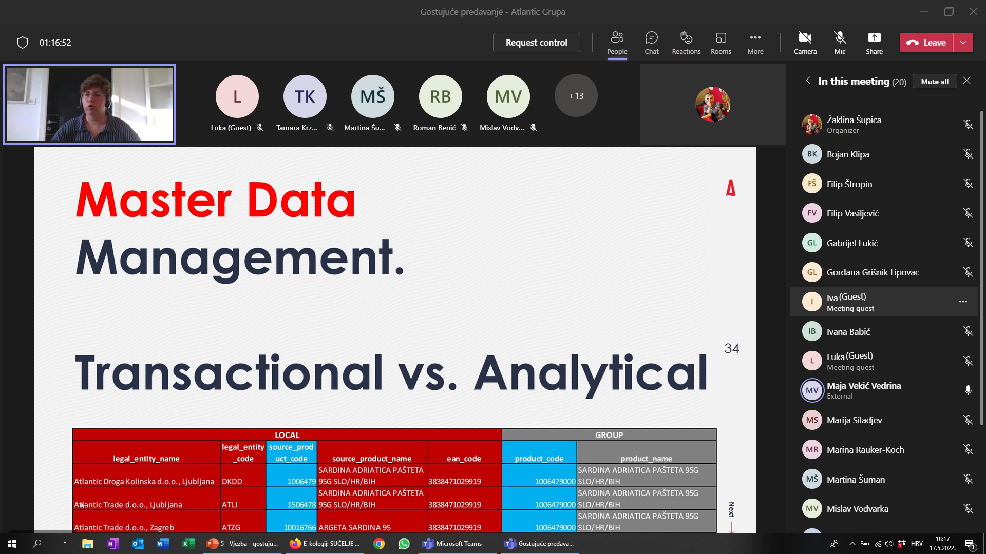 U sklopu kolegija Sučelje poslovnih i procesnih sustava studenti specijalističkog diplomskog stručnog studija Informacijske tehnologije u poslovnim sustavima su 17. svibnja 2022. godine imali priliku sudjelovati na gostujućim predavanjima putem Teams izlaganja, a na teme Upoznavanje s Atlantic Grupom – pogled iz perspektive IT arhitekture te Upoznavanje JGL proizvodnog sustava.