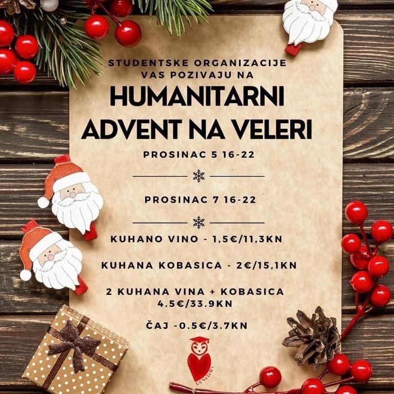 Studentski zbor i Udruga studenata Veleučilišta u Rijeci i ove godine od 5. 12. do 7. 12. 2023. organiziraju Humanitarni studentski Advent ispred zgrade Veleučilišta u Rijeci na adresi Vukovarska 58. Na adventskoj kućici studenti će nuditi adventske kobasice s dinstanim zeljem i kuhano vino od 16 do 22 sata. Posebnost Studentskog Adventa svakako je činjenica da su vino koje se koristi u pripremi ovog blagdanskog napitka proizveli studenti Poljoprivrednog odjela Veleučilišta u Rijeci. Advent će biti popraćen i glazbom, a kobasice i kuhano vino nudit će se po promotivnim cijenama. Studentski Advent ima prvenstveno humanitarni karakter, budući da će se sva prikupljena sredstva dati u humanitarne svrhe, kao i svake godine do sada. Prijašnjih godina studenti su prikupljene donacije donirali domovima za nezbrinutu djecu i potrebitim osobama, a ove su godine odlučili prikupljena sredstva donirati Azilu za nezbrinute pse Rijeka (Društvo za zaštitu životinja Rijeka) i Skloništu za nezbrinute životinje Lič. Humanitarni studentski Advent održava se već četvrtu godinu zaredom, a inicirale su ga i organizirale studentske organizacije koje djeluju na Veleučilištu u Rijeci, prvenstveno Studentski zbor Veleučilišta u Rijeci i Udruga studenata Veleučilišta u Rijeci.
