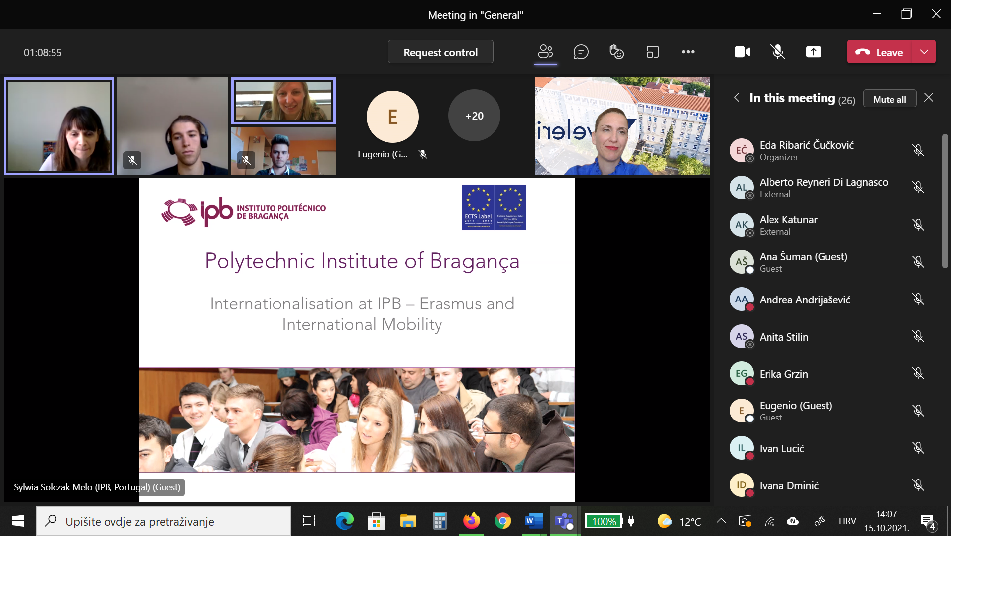 U petak, 15. 10. 2021., održan je virtualni Info dan za studente Veleučilišta u Rijeci na kojemu su prezentirani Erasmus+ i CEEPUS programi individualne mobilnosti. Nakon uvodnog pozdrava, prodekanica za međunarodnu suradnju, dr. sc. Eda Ribarić Čučković, predstavila je povjerenike za međunarodnu suradnju u okviru programa individualne mobilnosti na pojedinim odjelima i studijima izvan odjela Veleučilišta u Rijeci: dr. sc. Anitu Stilin, povjerenicu na Poslovnom odjelu te ECTS koordinatoricu i zamjenicu Erasmus koordinatorice, Eriku Gržin, povjerenicu na Odjelu sigurnosti na radu, Mladena Marinca, povjerenika na studijskom programu Održivi agroturizam, dr. sc. Andreju Andrijašević, povjerenicu na studijskom programu Telematika, dr. sc. Marinu Rončević, prof. v. š., povjerenicu na Prometnom odjelu te dr. sc. Ivanu Dminić Rojnić, v. pred., povjerenicu na Poljoprivrednom odjelu u Poreču. Studentima su predstavljena temeljna načela provedbe programa mobilnosti i prednosti koje ostvaruju sudjelovanjem u programima Erasmus+ i CEEPUS. Studenti su pozvani da se aktivno uključe u program te da se za pomoć obrate povjerenicima na pojedinim odjelima, odnosno Uredu za međunarodnu suradnju.