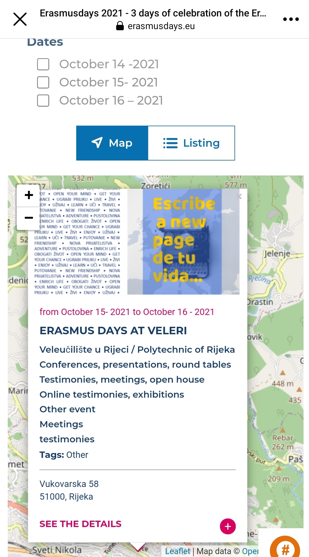 U razdoblju od 14. – 16. 10. 2021. diljem Europe održani su Dani Erasmusa (Erasmus Days) - prigodna godišnja proslava programa Erasmus+, najvećeg programa Europske unije namijenjenog obrazovanju, osposobljavanju, mladima i sportu. U okviru Dana Erasmusa korisnici programa organiziraju događanja kako bi predstavili svoje projekte i inspirirali potencijalne korisnike na uključivanje u Erasmus. Ove je godine organizirano rekordnih 5670 događanja u 67 zemalja svijeta, a u obilježavanju ovih Dana sudjelovalo je i Veleučilište u Rijeci upisavši se na Erasmus kartu događanja.