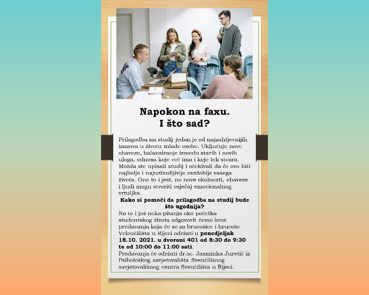 Dana 18. listopada 2021. godine održano je gostujuće predavanje pod nazivom "Studiram. Što se sve mijenja?". Zahvaljujemo dr. sc. Jasminki Juretić iz Psihološkog savjetovališta Sveučilišnog savjetovališnog centra Sveučilišta u Rijeci na održanom predavanju za naše brucoše. Brucoši su se na predavanju mogli upoznati s promjenama koje donosi početak studiranja i kako se najbolje prilagoditi tim promjenama.
