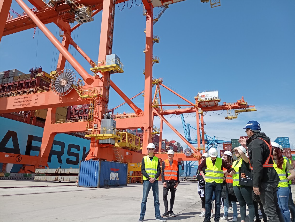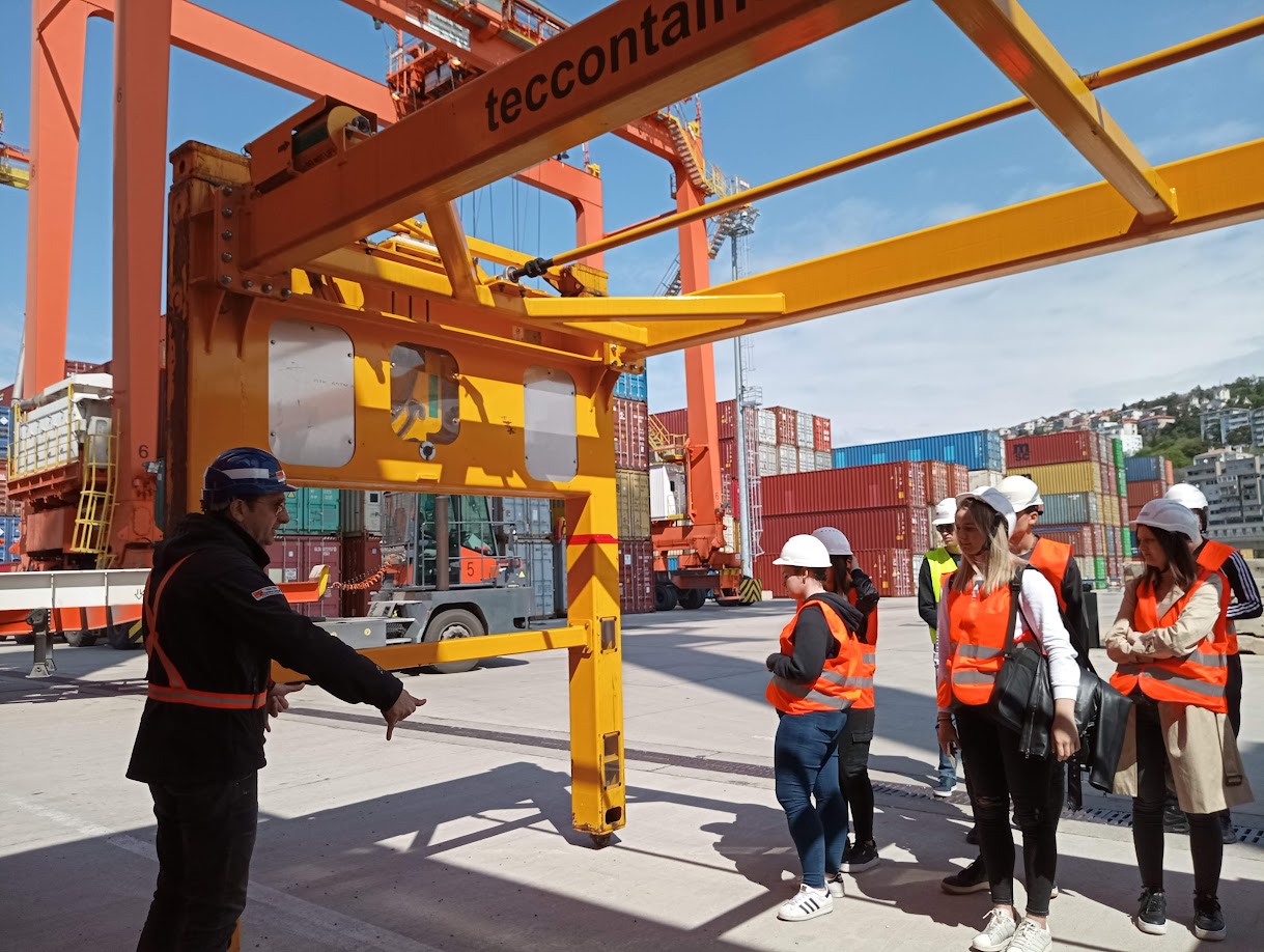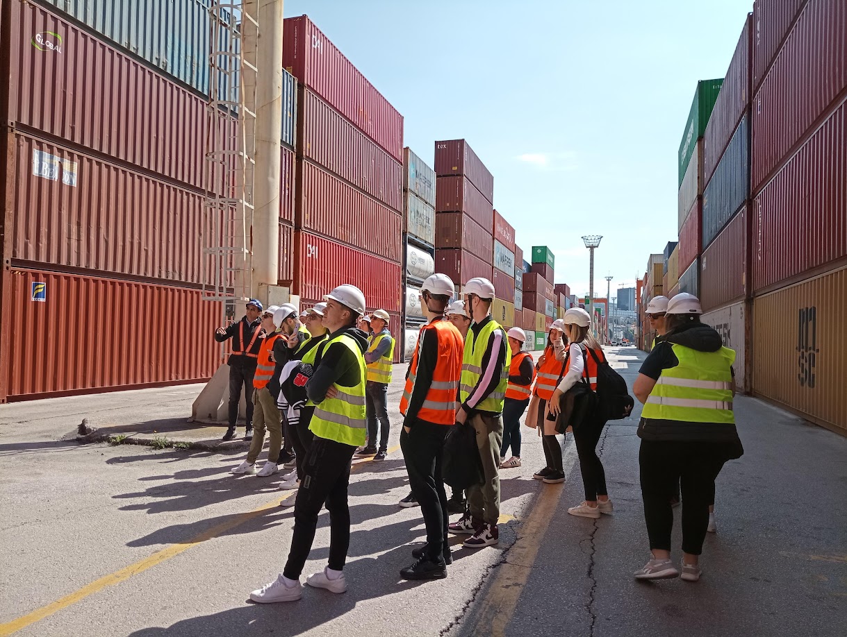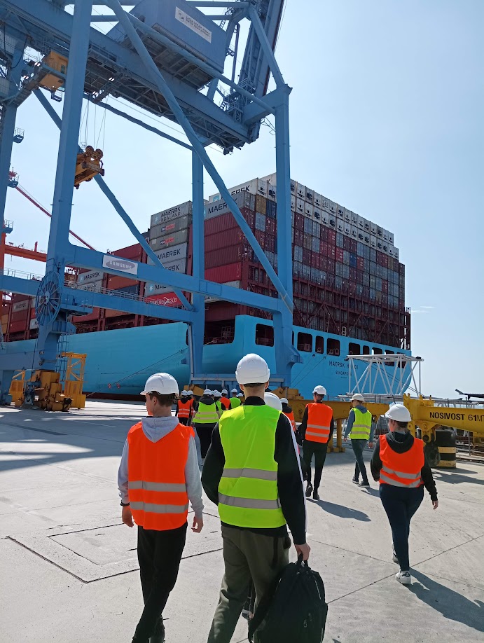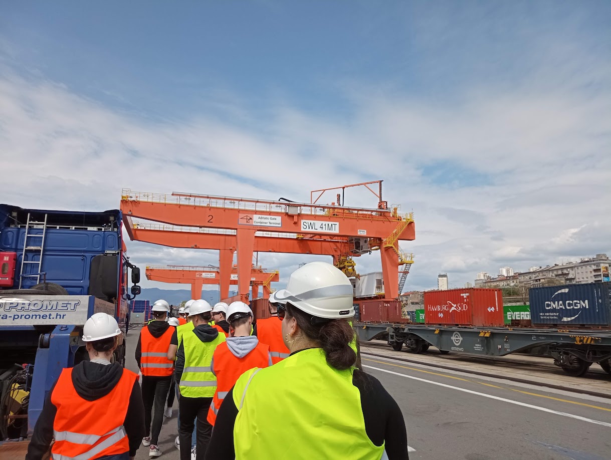 Dana 27. 4. 2023., u okviru kolegija Suvremeni prometni sustavi, studenti 1. godine stručnog prijediplomskog studija Cestovni promet posjetili su Kontejnerski terminal Jadranska vrata. Kroz terensku nastavu studenti su imali priliku razgledati različite vrste kontejnera i upoznati se s procesom manipulacije kontejnera obalnim, portalnim i autodizalicama te vidjeti postupak punjenja i pražnjenja kontejnera. U vrijeme obilaska na terminalu je bio privezan Maersk Hanoi, brod dužine 353 m koji može prevesti ukupno 15226 TEU, a povezuje luku Rijeka s Konom te su studenti iz „prve ruke“ mogli vidjeti proces ukrcaja kontejnera s vozila cestovnog prometa na kontejnerski brod maticu. Osim toga, pred kraj obilaska na terminal je stigao i vlak, te su studenti imali prilike vidjeti kako se vrši istovar kontejnera s vagona.
